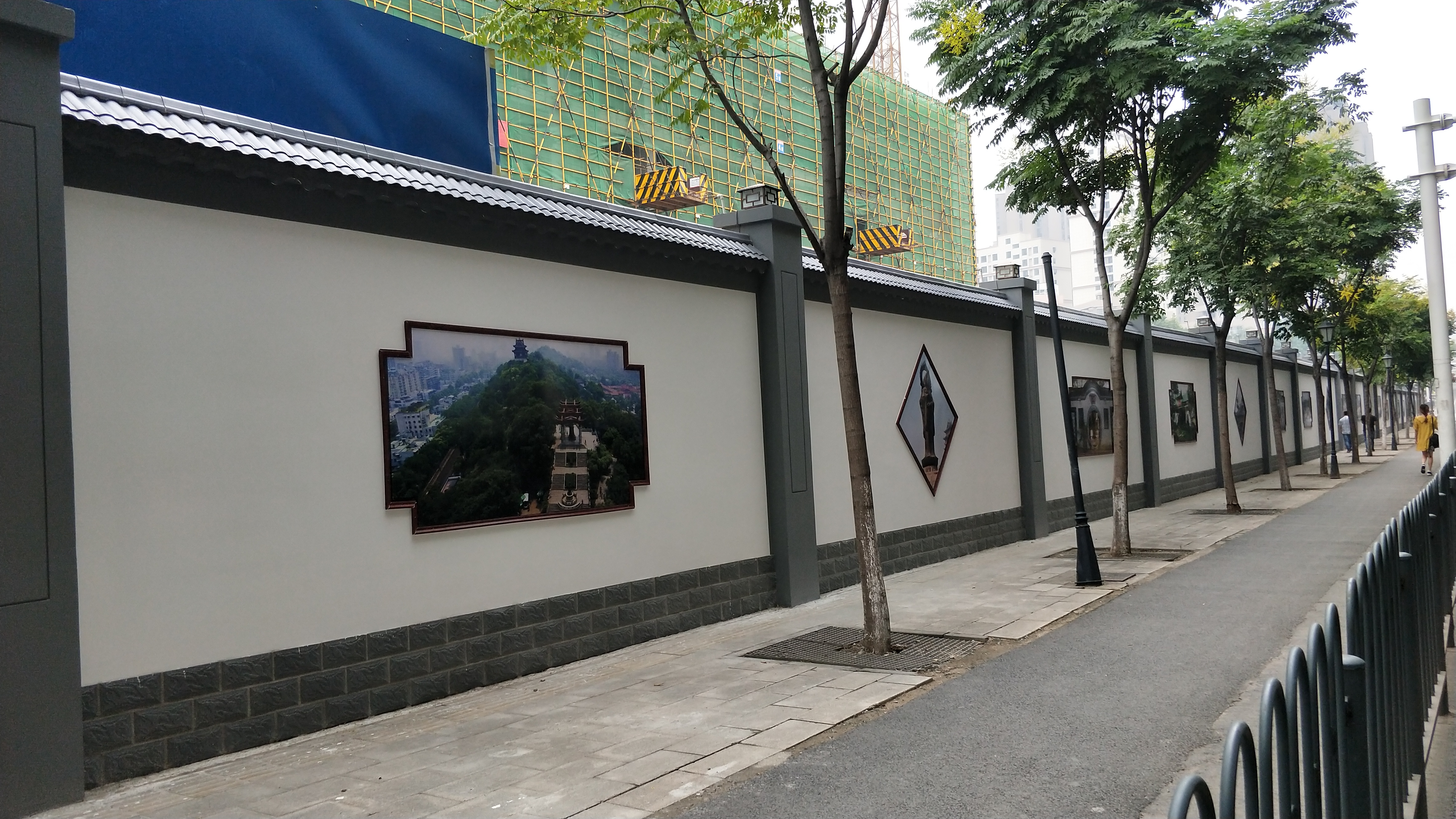 項目建設伊始便針對現(xiàn)場安全文明布置采取了專項措施,按照楚天杯的標準實施建設。工地圍墻方面,項目施工現(xiàn)場多采用磚砌體圍墻與“古典中國風”裝飾,裝飾材料均采用環(huán)保節(jié)能材料,高度高于2.5m,墻體安全牢固無破損,且進行了美化、亮化、彩色噴繪畫面及裝訂古典園林建筑畫框妝點。定期對宣傳墻、圍擋進行檢查、清洗和刷新。有歪斜破損的及時更換,保證其干凈、整潔、無亂涂、亂寫、亂張貼現(xiàn)象。