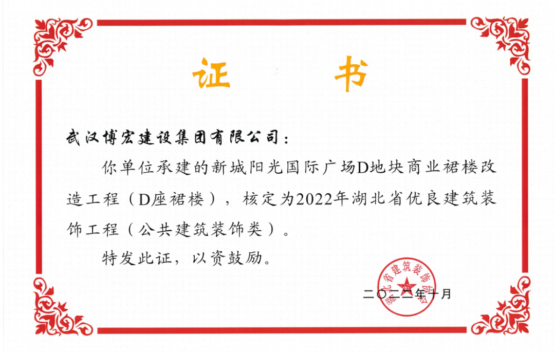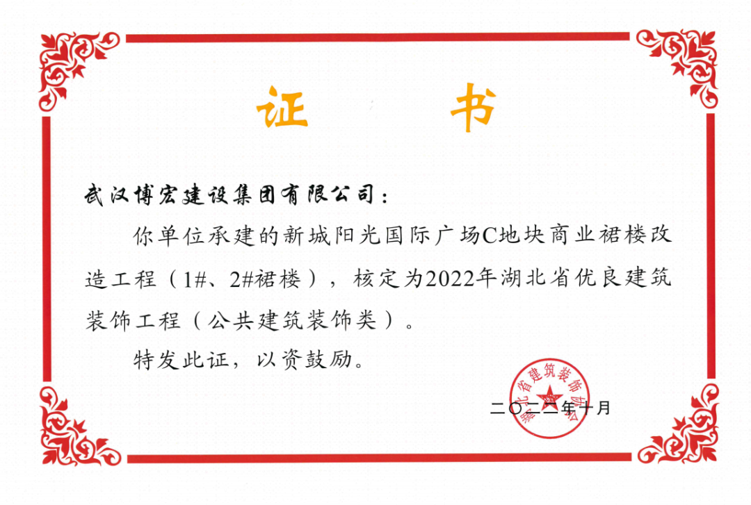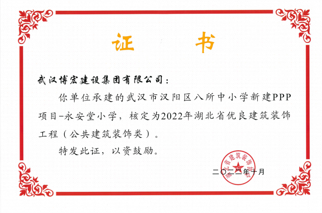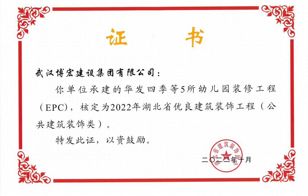 近日,湖北省建筑裝飾協(xié)會(huì)發(fā)布了《關(guān)于開(kāi)展2022年湖北省建筑裝飾工程質(zhì)量目標(biāo)考核工作的通知》,由博宏建設(shè)集團(tuán)承建的華發(fā)四季等5所幼兒園裝修工程(EPC)、新城陽(yáng)光國(guó)際廣場(chǎng)C地塊商業(yè)裙樓改造工程(1#、2#裙樓)、新城陽(yáng)光國(guó)際廣場(chǎng)D地塊商業(yè)裙樓改造工程(D座裙樓)、武漢市漢陽(yáng)區(qū)八所中小學(xué)新建PPP項(xiàng)目-永安堂小學(xué)被核定為“2022年湖北省優(yōu)良建筑裝飾工程(公共建筑裝飾類(lèi))”。