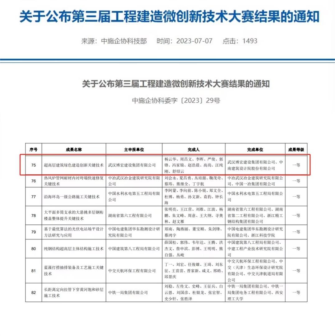 近日,中國施工企業(yè)管理協(xié)會公布第三屆工程建造微創(chuàng)新技術(shù)大賽獲獎結(jié)果。以中南科研設(shè)計中心建設(shè)項(xiàng)目為背景的“超高層建筑綠色建造創(chuàng)新關(guān)鍵技術(shù)”榮獲中施企協(xié)第三屆工程建造微創(chuàng)新技術(shù)大賽一等成果,這也是博宏建設(shè)集團(tuán)首次獲得該類賽事一等獎。