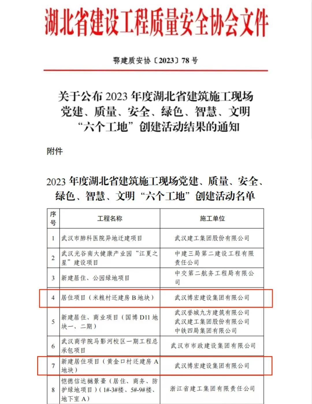 近日,湖北省建設(shè)工程質(zhì)量安全協(xié)會(huì)公布了2023年度湖北省建筑施工現(xiàn)場黨建、質(zhì)量、安全、綠色、智慧、文明“六個(gè)工地”評(píng)比結(jié)果名單,由博宏建設(shè)集團(tuán)承建的居住項(xiàng)目(米糧村還建房B地塊)、新建居住項(xiàng)目(黃金口村還建房A地塊)喜獲殊榮。