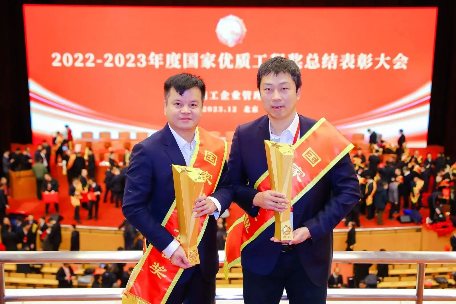 12月24日,2022~2023年度國(guó)家優(yōu)質(zhì)工程表彰大會(huì)在北京隆重召開,公司總經(jīng)理助理李暉、項(xiàng)目經(jīng)理童威接受頒獎(jiǎng)。博宏建設(shè)集團(tuán)捧回了兩座浸染著汗水與拼搏的榮譽(yù)獎(jiǎng)杯。